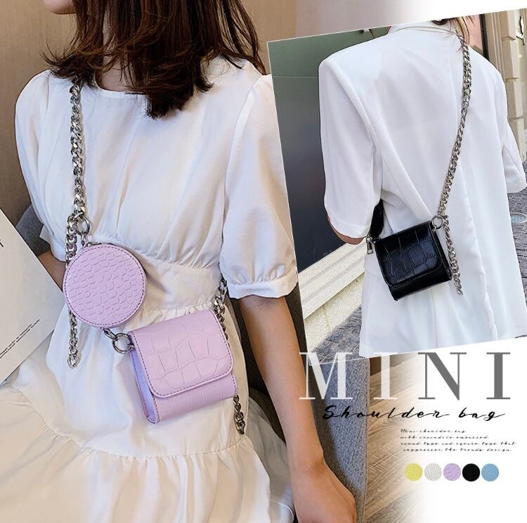トレンドのデザインをおさえたクロコ型押しラウンド型と四角型連れてミニショルダーバック