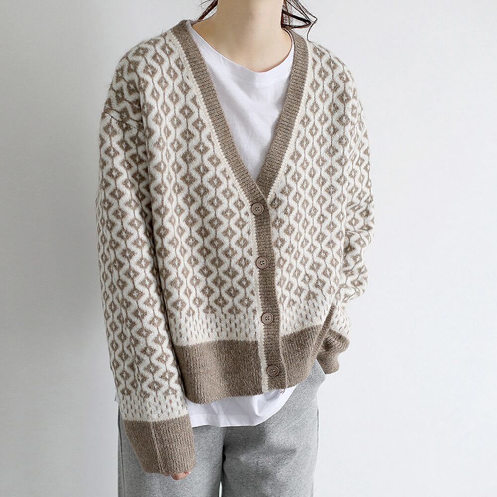 幾何学柄 ジャガードカーディガン レディース ダイス柄 ニットカーディガン